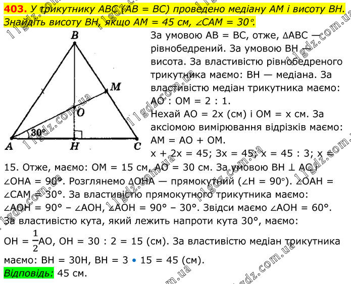 У трикутнику ABC (AB = BC) проведено медіану AM і висоту BH. Знайдіть висоту BH, якщо AM = 45 см, ∠CAM = 30°. За умовою АВ = ВС, отже, ∆АВС — рівнобедрений. За умовою ВН — висота. За властивістю рівнобедреного трикутника маємо: ВН — медіана. За властивістю медіан трикутника маємо: АО : ОМ = 2 : 1. Нехай АО = 2х (см) і ОМ = х см. За аксіомою вимірювання відрізків маємо: АМ = АО + ОМ. х + 2х = 45; Зх = 45; х = 45 : 3; х = 15. Отже, маємо: ОМ = 15 см, АО = 30 см. За умовою ВН ⊥ АС і ∠ОНА = 90°. Розглянемо ∆OНА — прямокутний (∠Н = 90°). ∠ОАН = ∠САМ = 30°. За властивістю прямокутного трикутника маємо: ∠АОН = 90° – ∠АОН, ∠АОН = 90° – 30°. Звідси маємо ∠АОН = 60°. За властивістю кута, який лежить напроти кута 30°, маємо: ОН = 1/2АО, OH = 30 : 2 = 15 (см). За властивістю медіан трикутника маємо: ВН = 30Н, ВН = 3 • 15 = 45 (см). Відповідь: 45 см.