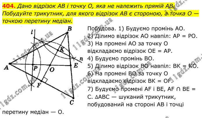 Дано відрізок AB і точку О, яка не належить прямій AB. Побудуйте трикутник, для якого відрізок AB є стороною, а точка O — точкою перетину медіан. Побудова. 1) Будуємо промінь АО. 2) Ділимо відрізок АО навпіл: АР = РО. 3) На промені АО за точку О відкладаємо відрізок ОЕ = АР. 4) Будуємо промінь ВО. 5) Ділимо відрізок ВО навпіл: ВК = КО. 6) На промені ВО за точку О відкладаємо відрізок ВК = ОF. 7) Будуємо промені АF і ВЕ, АF ∩ ВЕ = С. ∆АВС — шуканий трикутник, побудований на стороні АВ і точці перетину медіан — О.