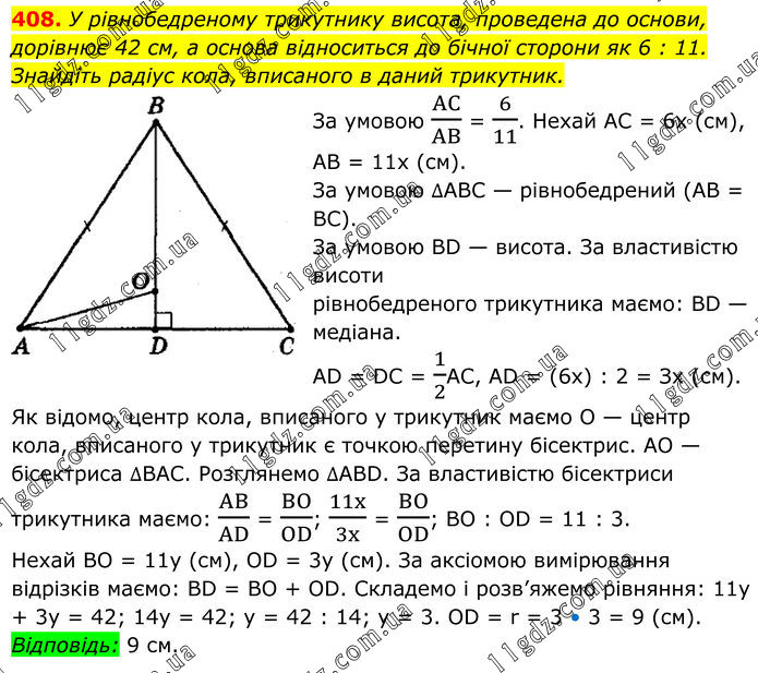 У рівнобедреному трикутнику висота, проведена до основи, дорівнює 42 см, а основа відноситься до бічної сторони як 6 : 11. Знайдіть радіус кола, вписаного в даний трикутник. За умовою AC/AB = 6/11. Нехай АС = 6х (см), АВ = 11х (см). За умовою ∆АВС — рівнобедрений (АВ = ВС). За умовою ВD — висота. За властивістю висоти рівнобедреного трикутника маємо: BD — медіана. AD = DC = 1/2AC, AD = (6х) : 2 = Зх (см). Як відомо, центр кола, вписаного у трикутник маємо О — центр кола, вписаного у трикутник є точкою перетину бісектрис. АО — бісектриса ∆ВАС. Розглянемо ∆ABD. За властивістю бісектриси трикутника маємо: AB/AD = BO/OD; 11x/3x = BO/OD; ВО : ОD = 11 : 3. Нехай ВО = 11у (см), ОD = 3y (см). За аксіомою вимірювання відрізків маємо: ВD = ВО + ОD. Складемо і розв’яжемо рівняння: 11у + 3y = 42; 14y = 42; у = 42 : 14; у = 3. ОD = r = 3 • 3 = 9 (см). Відповідь: 9 см.