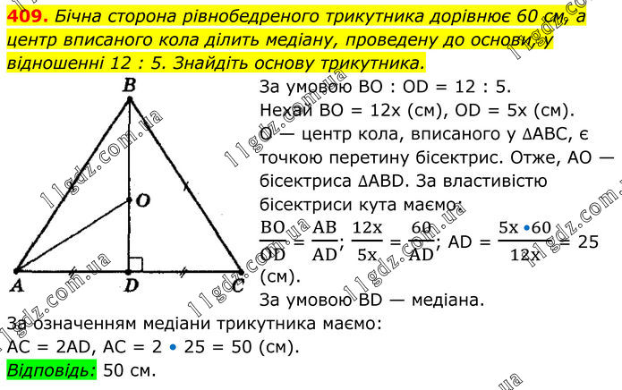 Бічна сторона рівнобедреного трикутника дорівнює 60 см, а центр вписаного кола ділить медіану, проведену до основи, у відношенні 12 : 5. Знайдіть основу трикутника. За умовою ВО : ОD = 12 : 5. Нехай ВО = 12х (см), ОD = 5х (см). О — центр кола, вписаного у ∆АВС, є точкою перетину бісектрис. Отже, АО — бісектриса ∆АВD. За властивістю бісектриси кута маємо: BO/OD = AB/AD; 12x/5x = 60/AD; AD = (5x •60)/12x = 25 (см). За умовою ВD — медіана. За означенням медіани трикутника маємо: АС = 2АD, АС = 2 • 25 = 50 (см). Відповідь: 50 см.