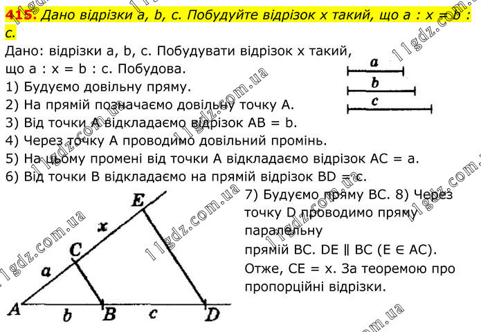 Дано відрізки а, b, с. Побудуйте відрізок х такий, що а : х = b : с. Дано: відрізки а, b, с. Побудувати відрізок х такий, що а : х = b : с. Побудова. 1) Будуємо довільну пряму. 2) На прямій позначаємо довільну точку А. 3) Від точки А відкладаємо відрізок АВ = b. 4) Через точку А проводимо довільний промінь. 5) На цьому промені від точки А відкладаємо відрізок АС = а. 6) Від точки В відкладаємо на прямій відрізок ВD = с. 7) Будуємо пряму ВС. 8) Через точку D проводимо пряму паралельну прямій ВС. DE ∥ ВС (Е ∈ АС). Отже, СЕ = х. За теоремою про пропорційні відрізки.