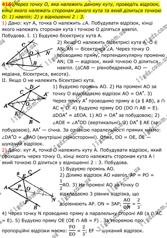 Через точку О, яка належить даному куту, проведіть відрізок, кінці якого належать сторонам даного кута та який ділиться точкою О: 1) навпіл; 2) у відношенні 2 : 3. 1) Дано: кут А, точка О належить ∠А. Побудувати відрізок, кінці якого належать сторонам кута і точкою О діляться навпіл. Побудова. І. 1) Будуємо бісектрису кута А. 2) Якщо О належить бісектрисі кута А, О ∈ АN, АN — бісектриса ∠А. Через точку О проводимо пряму, перпендикулярну променю АN; СВ — відрізок, який точкою О ділиться навпіл. (∆САВ — рівнобедрений, АО — медіана, бісектриса, висота). II. Якщо О не належить бісектрисі кута. 1) Будуємо промінь АО. 2) На промені АО за точку О відкладаємо відрізок АО = ОА’. 3) Через точку А’ проводимо пряму а (а ∥ АВ), а ∩ АС = D. 4) Будуємо пряму DО (DО ∩ АВ = Е). ∆DОА’ = ∆ЕОА. 1) АО = ОА’ за побудовою; 2) ∠AОЕ = ∠A’OD (вертикальні). 3) DА’ ∥ АE (за побудовою), АА’ — січна. За ознакою паралельності прямих маємо: ∠DA’O = ∠ЕАО (внутрішні різносторонні). Отже, DО = ОЕ, DЕ — шуканий відрізок. 2) Дано: кут А, точка О належить куту А. Побудувати відрізок, який проходить через точку О, кінці якого належать сторонам кута А і який точкою О ділиться у відношенні 2 : 3. Побудова. 1) Будуємо промінь АО. 2) Ділимо відрізок АО навпіл. АР = РО = 1/2АО. 3) На промені АО за точку О відкладаємо 3 рівних відрізка, що дорівнюють АР. ОN = ЗАР; AO/ON = 2/3. 4) Через точку N проводимо пряму а паралельну стороні АВ (а ∩ АС = Е). 5) Будуємо пряму ОЕ (ОЕ ∩ АВ = F) . За теоремою про пропорційні відрізки маємо: FO/EO = 2/3; ЕF — шуканий відрізок.