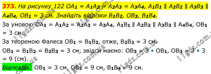373. На рисунку 122 OA1 = A1A2 = A2A3 = A3A4, A1B1 ∥ A2B2 ∥ A3B3 ∥ A4B4, OB1 = 3 см. Знайдіть відрізки B1B2, OB3, B1B4. За умовою ОА1 = А1А2 = А2A3 = А3A4, А1В1 ∥ А2В2 ∥ А3В3 ∥ А4В4, ОВ1 = 3 см. За теоремою Фалеса OВ1 = В1В2, отже, В2В2 = 3 см. ОВ1 = В1В2 = В2В3 = 3 см, звідси маємо: ОВ3 = 3 • OB1, OB3 = 3 • 3 = 9 (см). Відповідь: ОВ1 = 3 см, ОВ3 = 9 см, В1В4 = 9 см.