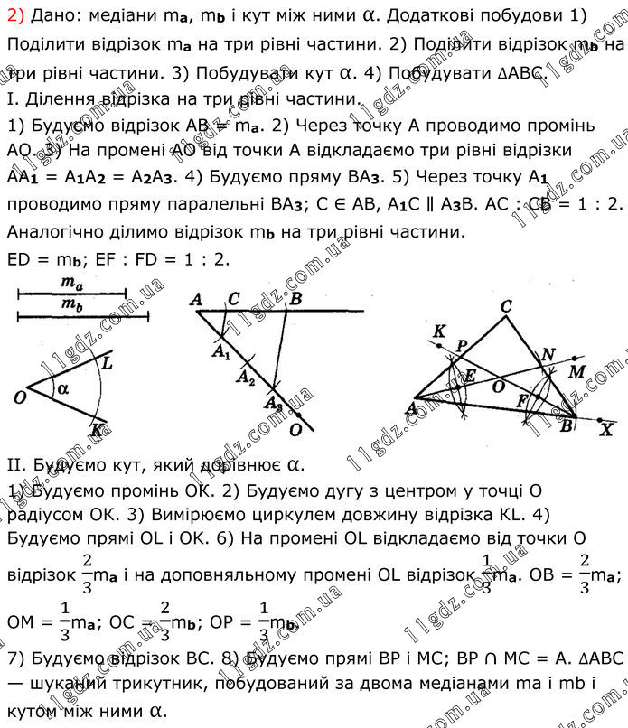 2) Дано: медіани mа, mb і кут між ними α. Додаткові побудови 1) Поділити відрізок mа на три рівні частини. 2) Поділити відрізок mb на три рівні частини. 3) Побудувати кут α. 4) Побудувати ∆АВС. І. Ділення відрізка на три рівні частини. 1) Будуємо відрізок АВ = mа. 2) Через точку А проводимо промінь АО. 3) На промені АО від точки А відкладаємо три рівні відрізки АА1 = А1А2 = А2А3. 4) Будуємо пряму ВА3. 5) Через точку А1 проводимо пряму паралельні ВА3; С ∈ АВ, А1С ∥ А3В. АС : СВ = 1 : 2. Аналогічно ділимо відрізок mb на три рівні частини. ED = mb; EF : FD = 1 : 2. II. Будуємо кут, який дорівнює α. 1) Будуємо промінь ОК. 2) Будуємо дугу з центром у точці О радіусом ОК. 3) Вимірюємо циркулем довжину відрізка КL. 4) Будуємо прямі OL i OK. 6) На промені OL відкладаємо від точки О відрізок 2/3ma і на доповняльному промені OL відрізок 1/3ma. OB = 2/3ma; OM = 1/3ma; OC = 2/3mb; OP = 1/3mb. 7) Будуємо відрізок ВС. 8) Будуємо прямі ВР і МС; ВР ∩ МС = А. ∆АВС — шуканий трикутник, побудований за двома медіанами mа і mb і кутом між ними α.