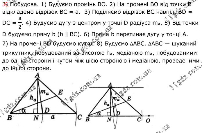 3) Побудова. 1) Будуємо промінь ВО. 2) На промені ВО від точки В відкладемо відрізок ВС = а. 3) Поділяємо відрізок ВС навпіл, BD = DC = a/2. 4) Будуємо дугу з центром у точці D радіуса mа. 5) Від точки D будуємо пряму b (b ∥ ВС). 6) Пряма b перетинає дугу у точці А. 7) На промені ВО будуємо кут α. 8) Будуємо ∆АВС. ∆АВС — шуканий трикутник, побудований за висотою ha, медіаною mа, побудованими до однієї сторони і кутом між цією стороною і медіаною, проведеними до іншої сторони.