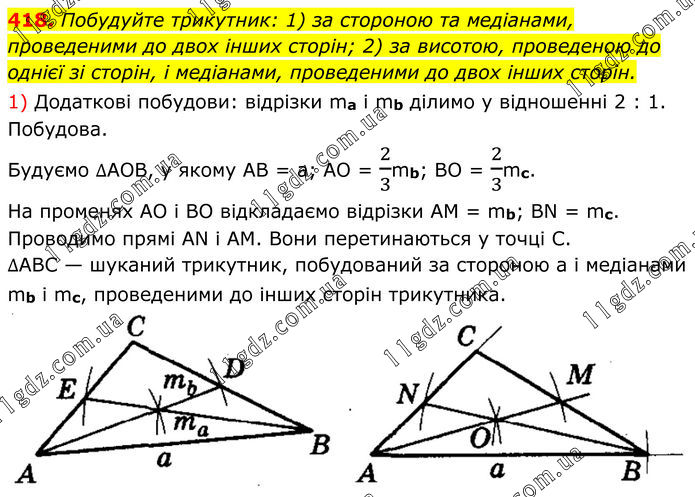418. Побудуйте трикутник: 1) за стороною та медіанами, проведеними до двох інших сторін; 2) за висотою, проведеною до однієї зі сторін, і медіанами, проведеними до двох інших сторін. 1) Додаткові побудови: відрізки mа і mb ділимо у відношенні 2 : 1. Побудова. Будуємо ∆АОВ, у якому AB = а; АО = 2/3mb; ВО = 2/3mс. На променях АО і ВО відкладаємо відрізки AM = mb; BN = mс. Проводимо прямі AN і AM. Вони перетинаються у точці С. ∆ABC — шуканий трикутник, побудований за стороною а і медіанами mb і mc, проведеними до інших сторін трикутника.