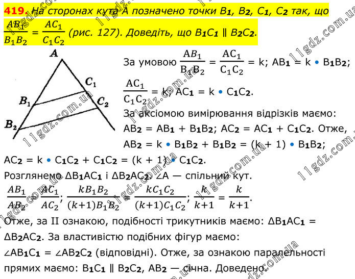 419. На сторонах кута А позначено точки B1, B2, C1, C2 так, що (AB_1)/(B_1 B_2 ) = (AC_1)/(C_1 C_2 ) (рис. 127). Доведіть, що B1C1 ∥ B2C2. За умовою (AB_1)/(B_1 B_2 ) = (AC_1)/(C_1 C_2 ) = k; AB1 = k • B1B2; (AC_1)/(C_1 C_2 ) = k; АС1 = k • С1С2. За аксіомою вимірювання відрізків маємо: АВ2 = АВ1 + В1В2; АС2 = АС1 + С1С2. Отже, АВ2 = k • В1В2 + В1В2 = (k + 1) • В1В2; АС2 = k • С1С2 + С1С2 = (k + 1) • С1С2. Розглянемо ∆В1АС1 і ∆В2АС2. ∠А — спільний кут. (AB_1)/(AB_2 ) = (AC_1)/(AC_2 ); (kB_1 B_2)/((k+1)B_1 B_2 ) = (kC_1 C_2)/((k+1)C_1 C_2 ); k/(k+1) = k/(k+1). Отже, за II ознакою, подібності трикутників маємо: ∆В1АС1 = ∆В2АС2. За властивістю подібних фігур маємо: ∠АВ1С1 = ∠АВ2С2 (відповідні). Отже, за ознакою паралельності прямих маємо: В1С1 ∥ В2С2, АВ2 — січна. Доведено.