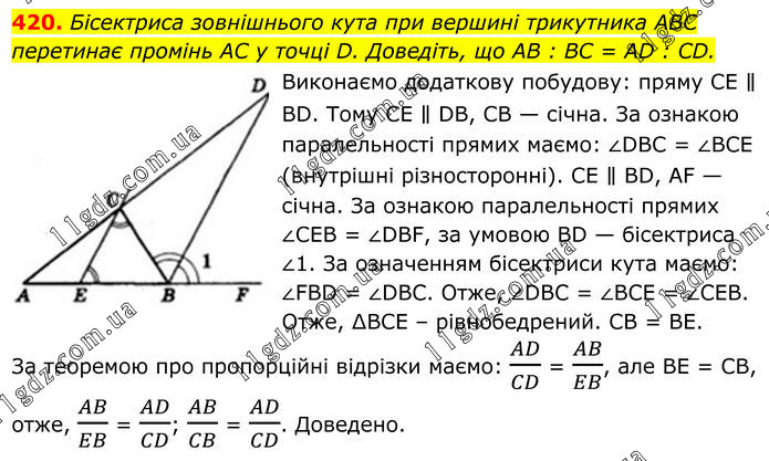 Бісектриса зовнішнього кута при вершині трикутника ABC перетинає промінь AC у точці D. Доведіть, що AB : BC = AD : CD. Виконаємо додаткову побудову: пряму СЕ ∥ ВD. Тому СЕ ∥ DВ, СВ — січна. За ознакою паралельності прямих маємо: ∠DВС = ∠ВСЕ (внутрішні різносторонні). СЕ ∥ BD, АF — січна. За ознакою паралельності прямих ∠СЕВ = ∠DВF, за умовою BD — бісектриса ∠1. За означенням бісектриси кута маємо: ∠FВD = ∠DВС. Отже, ∠DВС = ∠ВСЕ = ∠СЕВ. Отже, ∆ВСЕ – рівнобедрений. CB = BE. За теоремою про пропорційні відрізки маємо: AD/CD = AB/EB, але ВЕ = СВ, отже, AB/EB = AD/CD; AB/CB = AD/CD. Доведено.
