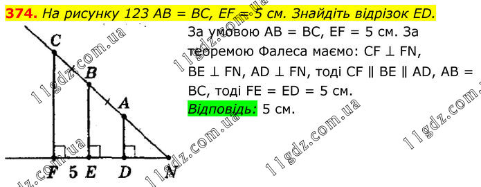 374. На рисунку 123 AB = BC, EF = 5 см. Знайдіть відрізок ED. За умовою АВ = ВС, ЕF = 5 см. За теоремою Фалеса маємо: СF ⊥ FN, ВЕ ⊥ FN, АD ⊥ FN, тоді СF ∥ ВE ∥ АD, АВ = ВС, тоді FЕ = ED = 5 см. Відповідь: 5 см.