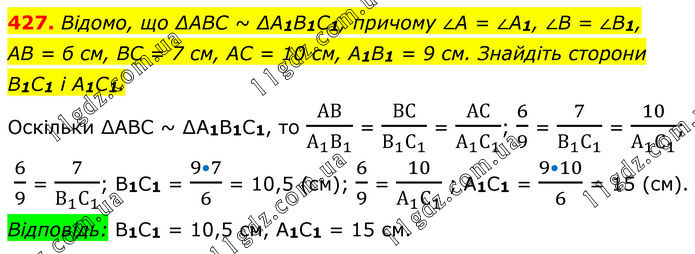 Відомо, що ∆ABC ~ ∆A1B1C1, причому ∠A = ∠A1, ∠B = ∠B1, AB = б см, BC = 7 см, AC = 10 см, A1B1 = 9 см. Знайдіть сторони B1C1 і A1C1. Оскільки ∆АВС ~ ∆А1В1С1, то АВ/(А_1 В_1 ) = ВС/(В_1 С_1 ) = АС/(А_1 С_1 ); 6/9 = 7/(В_1 С_1 ) = 10/(А_1 С_1 ); 6/9 = 7/(В_1 С_1 ); В1С1 = (9•7)/6 = 10,5 (см); 6/9 = 10/(А_1 С_1 ) ; А1С1 = (9•10)/6 = 15 (см). Відповідь: В1С1 = 10,5 см, А1С1 = 15 см.