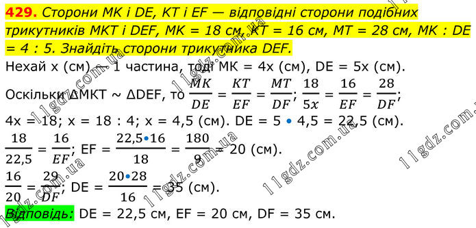 429. Сторони MK і DE, KT і EF — відповідні сторони подібних трикутників MKT і DEF, MK = 18 см, KT = 16 см, MT = 28 см, MK : DE = 4 : 5. Знайдіть сторони трикутника DEF. Нехай х (см) — 1 частина, тоді МК = 4х (см), DЕ = 5х (см). Оскільки ∆МКТ ~ ∆DЕF, то MK/DE = KT/EF = MT/DF; 18/5x = 16/EF = 28/DF; 4x = 18; x = 18 : 4; x = 4,5 (см). DE = 5 • 4,5 = 22,5 (см). 18/22,5 = 16/EF; ЕF = (22,5•16)/18 = 180/9 = 20 (см). 16/20 = 29/DF; DЕ = (20•28)/16 = 35 (см). Відповідь: DЕ = 22,5 см, EF = 20 см, DF = 35 см.