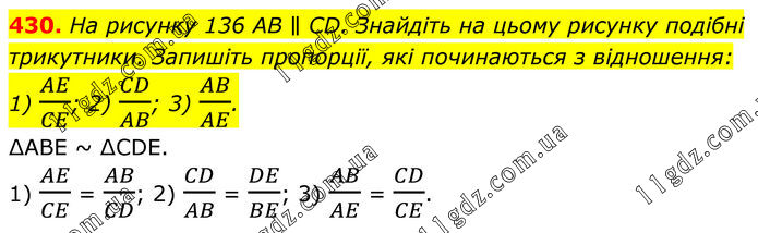 430. На рисунку 136 AB ∥ CD. Знайдіть на цьому рисунку подібні трикутники. Запишіть пропорції, які починаються з відношення: 1) AE/CE; 2) CD/AB; 3) AB/AE. ∆АВЕ ~ ∆СDЕ. 1) AE/CE = AB/CD; 2) CD/AB = DE/BE; 3) AB/AE = CD/CE.