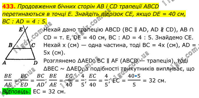 Продовження бічних сторін AB і CD трапеції ABCD перетинаються в точці Е. Знайдіть відрізок CE, якщо DE = 40 см, BC : AD = 4 : 5. Нехай дано трапецію АВСD (BС ∥ АD, АD ∦ СD), АB ∩ СD = т. Е, DЕ = 40 см, ВС : АD = 4 : 5. Знайдемо СЕ. Нехай х (см) — одна частина, тоді ВС = 4х (см), АD = 5х (см). Розглянемо ∆АЕD: ВС ∥ АF (АВСD — трапеція), тоді ∆ВЕС ~ ∆АЕD, з подібності трикутників випливає, що BE/AE = EC/ED = BC/AD; BE/AE = EC/40 = 4/5; EC/40 = 4/5; ЕС = (40•5)/5 = 32 см. Відповідь: ЕС = 32 см.