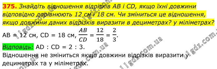 375. Знайдіть відношення відрізків AB і CD, якщо їхні довжини відповідно дорівнюють 12 см і 18 см. Чи зміниться це відношення, якщо довжини даних відрізків виразити в дециметрах? у міліметрах? AB = 12 см, CD = 18 см, AB/CD = 12/18 = 2/3. Відповідь: АD : СD = 2 : 3. Відношення не зміниться якщо довжини відрізків виразити у дециметрах та у міліметрах.