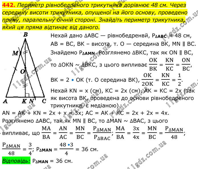 Периметр рівнобедреного трикутника дорівнює 48 см. Через середину висоти трикутника, опущеної на його основу, проведено пряму, паралельну бічній стороні. Знайдіть периметр трикутника, який ця пряма відтинає від даного. Нехай дано ∆АВС — рівнобедренвй, Р∆ABC = 48 см, АВ = ВС, ВК – висота, т. О — середина ВК, МN ∥ ВС. Знайдемо Р∆AMN. Розглянемо ∆ВКС, так як ОN ∥ ВС, то ∆ОКN ~ ∆ВКС, з цього випливає OK/BK = KN/KC = ON/BC, ВК = 2 • ОК (т. О середина ВК), OK/2OK = KN/KC = 1/2. Нехай KN = х (см), КС = 2х (см), АK = КС = 2х (так як висота ВК, проведена до основи рівнобедреного трикутника, є медіаною). AN = АК + KN = 2х + х = 3x; АС = АК + КС = 2х + 2х = 4х. Розглянемо ∆ABC, так як МN ∥ ВС, то ∆MAN ~ ∆ВАС, з цього випливає, що MA/BA = AN/AC = MN/BC = P_∆MAN/P_∆BAC ; MA/BA = 3x/4x = MN/BC = P_∆MAN/48; P_∆MAN/48 = 3/4; P∆MAN = (48 •3)/4 = 36 см. Відповідь: P∆MAN = 36 см.