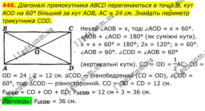 Діагоналі прямокутника ABCD перегинаються в точці О, кут AOD на 60° більший за кут AOB, AC = 24 см. Знайдіть периметр трикутника COD. Нехай ∠AОВ = х, тоді ∠АОD = х + 60°. ∠АОВ + ∠АОD = 180° (як суміжні кути). х + х + 60° = 180°; 2х = 120°; х = 60°. ∠АОВ = 60°. ∠СОD = ∠АОВ = 60° (вертикальні кути). CO = OD = 1/2АС; CO = ОD = 24 : 2 = 12 см. ∆СОD — рівнобедрений (CO = OD), ∠COD = 60°, тоді ∆СОD — рівносторонній. CO = OD = СD = 12 см. P∆COD = СО + ОD + СD; P∆COD = 12 см • 3 = 36 см. Відповідь: P∆COD = 36 см.
