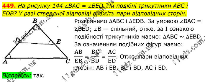 На рисунку 144 ∠BAC = ∠BED. Чи подібні трикутники ABC і EDB? У разі ствердної відповіді вкажіть пари відповідних сторін. Розглянемо ∆АВС і ∆EDB. За умовою ∠ВАС = ∠BED; ∠В — спільний, отже, за І ознакою подібності трикутників маємо: ∆АВС ~ ∆ЕВD. За означенням подібних фігур маємо: AB/EB = BC/BD = AC/ED. Отже, пари відповідних сторін: АВ і ЕВ, ВС і BD, АС і ED. Відповідь: так.