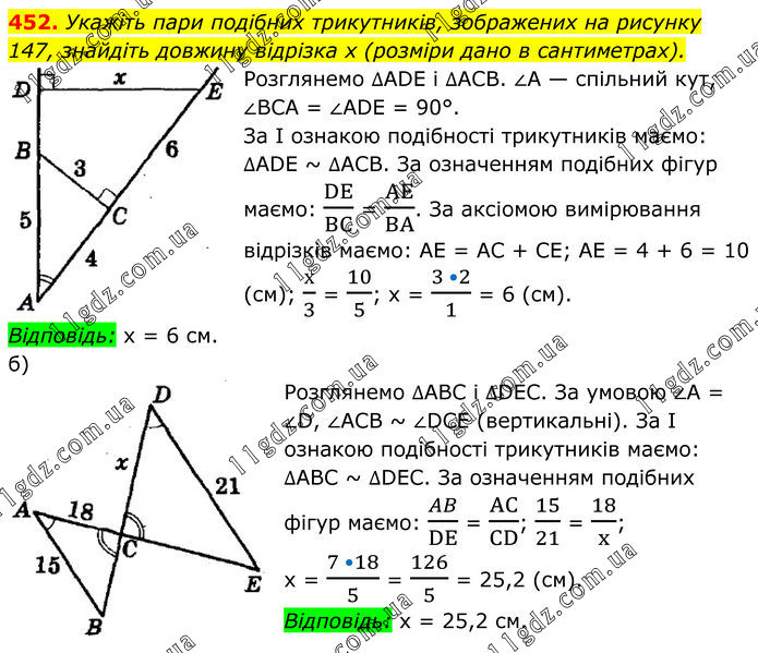 Укажіть пари подібних трикутників, зображених на рисунку 147, знайдіть довжину відрізка х (розміри дано в сантиметрах). Розглянемо ∆ADE і ∆АСВ. ∠A — спільний кут, ∠BCA = ∠ADE = 90°. За І ознакою подібності трикутників маємо: ∆ADE ~ ∆АСВ. За означенням подібних фігур маємо: DE/BC = AE/BA. За аксіомою вимірювання відрізків маємо: АЕ = АС + СЕ; АЕ = 4 + 6 = 10 (см); х/3 = 10/5; х = (3 •2)/1 = 6 (см). Відповідь: х = 6 см. б) Розглянемо ∆ABC і ∆DEC. За умовою ∠A = ∠D, ∠ACB ~ ∠DCE (вертикальні). За І ознакою подібності трикутників маємо: ∆ABC ~ ∆DEC. За означенням подібних фігур маємо: AB/DE = AC/CD; 15/21 = 18/x; x = (7 •18)/5 = 126/5 = 25,2 (см). Відповідь: х = 25,2 см.