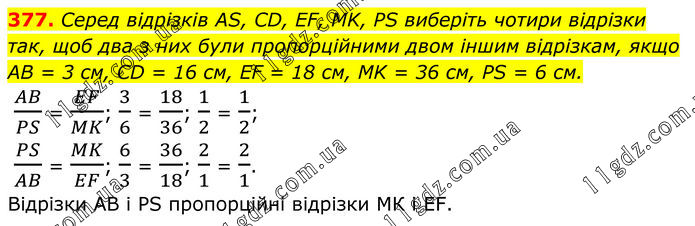 377. Серед відрізків AS, CD, EF, MK, PS виберіть чотири відрізки так, щоб два з них були пропорційними двом іншим відрізкам, якщо AB = 3 см, CD = 16 см, EF = 18 см, MK = 36 см, PS = 6 см. AB/PS = EF/MK; 3/6 = 18/36; 1/2 = 1/2; PS/AB = MK/EF; 6/3 = 36/18; 2/1 = 2/1. Відрізки АВ і PS пропорційні відрізки МК і EF.