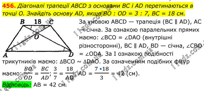 Діагоналі трапеції ABCD з основами BC і AD перетинаються в точці О. Знайдіть основу AD, якщо BO : OD = 3 : 7, BC = 18 см. За умовою АВСD — трапеція (ВС ∥ АD), АС — січна. За ознакою паралельних прямих маємо: ∠BCO = ∠DАО (внутрішні різносторонні), ВС ∥ АD, ВD — січна, ∠СВО = ∠ODA. За І ознакою подібності трикутників маємо: ∆ВСО ~ ∆DАО. За означенням подібних фігур маємо: BO/OD = BC/AD; 3/7 = 18/AD; AD = (7 •18)/3 = 42 (см). Відповідь: АВ = 42 см.