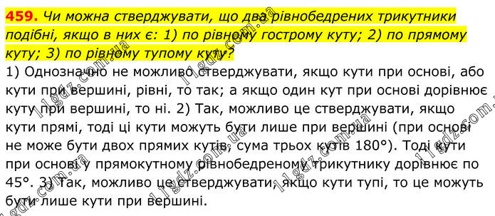 Чи можна стверджувати, що два рівнобедрених трикутники подібні, якщо в них є: 1) по рівному гострому куту; 2) по прямому куту; 3) по рівному тупому куту? 1) Однозначно не можливо стверджувати, якщо кути при основі, або кути при вершині, рівні, то так; а якщо один кут при основі дорівнює куту при вершині, то ні. 2) Так, можливо це стверджувати, якщо кути прямі, тоді ці кути можуть бути лише при вершині (при основі не може бути двох прямих кутів, сума трьох кутів 180°). Тоді кути при основі у прямокутному рівнобедреному трикутнику дорівнює по 45°. 3) Так, можливо це стверджувати, якщо кути тупі, то це можуть бути лише кути при вершині.