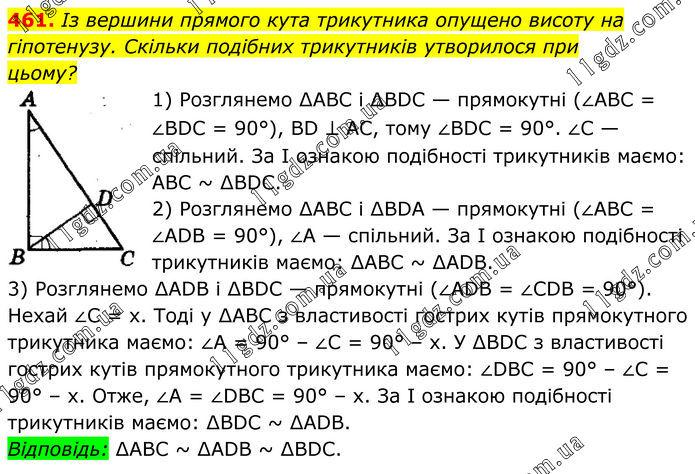 Із вершини прямого кута трикутника опущено висоту на гіпотенузу. Скільки подібних трикутників утворилося при цьому? 1) Розглянемо ∆АВС і ∆ВDС — прямокутні (∠АВС = ∠ВDС = 90°), BD ⊥ АС, тому ∠ВDС = 90°. ∠С — спільний. За І ознакою подібності трикутників маємо: АВС ~ ∆BDC. 2) Розглянемо ∆АВС і ∆ВDА — прямокутні (∠АВС = ∠АDВ = 90°), ∠А — спільний. За І ознакою подібності трикутників маємо: ∆АВС ~ ∆АDВ. 3) Розглянемо ∆АDВ і ∆ВDС — прямокутні (∠ADВ = ∠СDВ = 90°). Нехай ∠С = х. Тоді у ∆АВС з властивості гострих кутів прямокутного трикутника маємо: ∠А = 90° – ∠С = 90° – х. У ∆BDС з властивості гострих кутів прямокутного трикутника маємо: ∠DВС = 90° – ∠С = 90° – х. Отже, ∠А = ∠DВС = 90° – х. За І ознакою подібності трикутників маємо: ∆ВDС ~ ∆АDВ. Відповідь: ∆АВС ~ ∆АDВ ~ ∆ВDС.