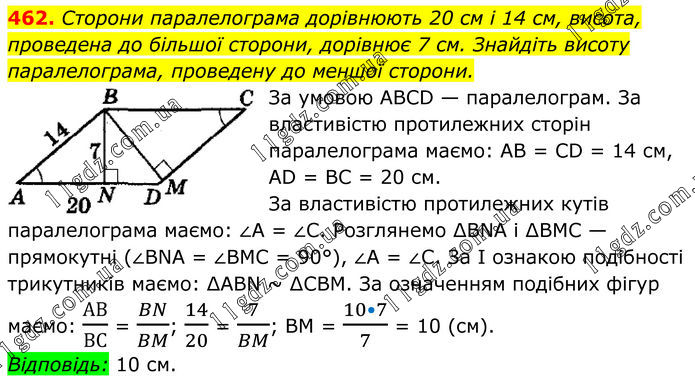 Сторони паралелограма дорівнюють 20 см і 14 см, висота, проведена до більшої сторони, дорівнює 7 см. Знайдіть висоту паралелограма, проведену до меншої сторони. За умовою АВСD — паралелограм. За властивістю протилежних сторін паралелограма маємо: АВ = СD = 14 см, АD = ВС = 20 см. За властивістю протилежних кутів паралелограма маємо: ∠А = ∠С. Розглянемо ∆ВNА і ∆ВМС — прямокутні (∠ВNА = ∠ВМС = 90°), ∠A = ∠С. За І ознакою подібності трикутників маємо: ∆АВN ~ ∆СВМ. За означенням подібних фігур маємо: АВ/ВС = BN/BM; 14/20 = 7/BM; BM = (10•7)/7 = 10 (см). Відповідь: 10 см.