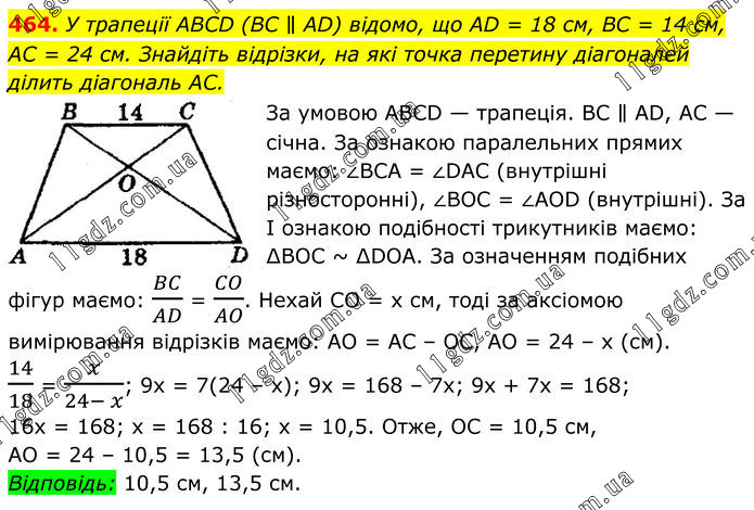 У трапеції ABCD (BC ∥ AD) відомо, що AD = 18 см, BC = 14 см, AC = 24 см. Знайдіть відрізки, на які точка перетину діагоналей ділить діагональ AC. За умовою АВСD — трапеція. ВС ∥ АD, АС — січна. За ознакою паралельних прямих маємо: ∠ВСА = ∠DАС (внутрішні різносторонні), ∠ВОС = ∠АОD (внутрішні). За І ознакою подібності трикутників маємо: ∆ВОС ~ ∆DОА. За означенням подібних фігур маємо: BC/AD = CO/AO. Нехай СО = х см, тоді за аксіомою вимірювання відрізків маємо: АО = АС – ОС, АО = 24 – x (см). 14/18 = x/(24- x); 9x = 7(24 – x); 9х = 168 – 7х; 9х + 7х = 168; 16x = 168; x = 168 : 16; x = 10,5. Отже, ОС = 10,5 см, АО = 24 – 10,5 = 13,5 (см). Відповідь: 10,5 см, 13,5 см.