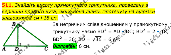 найдіть висоту прямокутного трикутника, проведену з вершини прямого кута, якщо вона ділить гіпотенузу на відрізки завдовжки 2 см і 18 см. За метричним співвідношенням у прямокутному трикутнику маємо ВD2 = АD • DС; ВD2 = 2 • 18; ВD2 = 36; ВD = √36 = 6 см. Відповідь: 6 см.