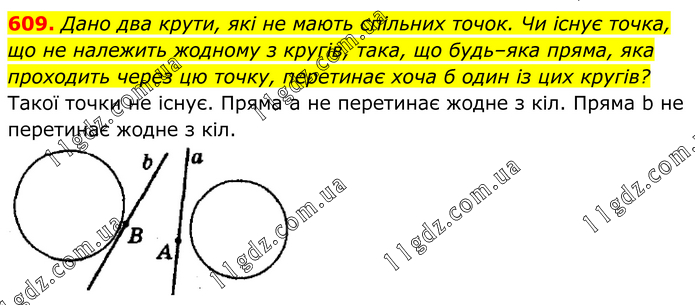 Дано два крути, які не мають спільних точок. Чи існує точка, що не належить жодному з кругів, така, що будь–яка пряма, яка проходить через цю точку, перетинає хоча б один із цих кругів? Такої точки не існує. Пряма а не перетинає жодне з кіл. Пряма b не перетинає жодне з кіл.