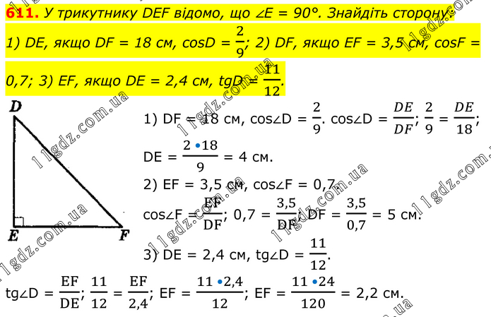 У трикутнику DEF відомо, що ∠E = 90°. Знайдіть сторону: 1) DE, якщо DF = 18 см, cosD = 2/9; 2) DF, якщо EF = 3,5 см, cosF = 0,7; 3) EF, якщо DE = 2,4 см, tgD = 11/12. 1) DF = 18 см, cos∠D = 2/9. cos∠D = DE/DF; 2/9 = DE/18; DE = (2 •18)/9 = 4 см. 2) EF = 3,5 см, cos∠F = 0,7. cos∠F = EF/DF; 0,7 = 3,5/DF; DF = 3,5/0,7 = 5 см. 3) DE = 2,4 см, tg∠D = 11/12. tg∠D = EF/DE; 11/12 = EF/2,4; EF = (11 •2,4)/12; EF = (11 •24)/120 = 2,2 см.