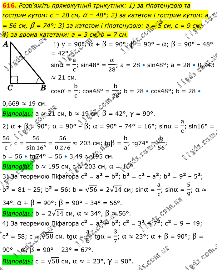 Розв’яжіть прямокутний трикутник: 1) за гіпотенузою та гострим кутом: с = 28 см, α = 48°; 2) за катетом і гострим кутом: а = 56 см, β = 74°; 3) за катетом і гіпотенузою: а = 5 см, с = 9 см; 4) за двома катетами: а = 3 см, b = 7 см. 1) γ = 90°. α + β = 90°; β = 90° – α; β = 90° – 48° = 42°. sinα = a/c; sin48° = α/28; а = 28 • sin48°; а = 28 • 0,743 ≈ 21 см. соsα = b/c; сов48° = b/28; b = 28 • соs48°; b = 28 • 0,669 ≈ 19 см. Відповідь: а ≈ 21 см, b ≈ 19 см, β = 42°, γ = 90°. 2) α + β = 90°; α = 90° – β; α = 90° – 74° = 16°; sinα = a/c; sin16° = 56/c; c = 56/sin〖16°〗 = 56/0,276 ≈ 203 см; tgβ = b/a; tg74° = b/56; b = 56 • tg74° = 56 • 3,49 ≈ 195 см. Відповідь: b ≈ 195 см, с ≈ 203 см, α = 16°. 3) За теоремою Піфагора с2 = а2 + b2; b2 = с2 – а2; b2 = 92 – 52; b2 = 81 – 25; b2 = 56; b = √56 = 2√14 см; sinα = a/c; sinα = 5/9; α ≈ 34°. α + β = 90°; β = 90° – 34° = 56°. Відповідь: b = 2√14 см, α ≈ 34°, β ≈ 56°. 4) За теоремою Піфагора с2 = а2 + b2; с2 = З2 + 72; с2 = 9 + 49; с2 = 58; с = √58 см. tgα = a/b; tgα = 3/7; α ≈ 23°; α + β = 90°; β = 90° – α; β = 90° – 23° = 67°. Відповідь: с = √58 см, α ≈ = 23°, γ = 90°.