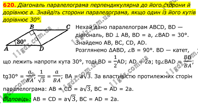 Діагональ паралелограма перпендикулярна до його сторони й дорівнює а. Знайдіть сторони паралелограма, якщо один із його кутів дорівнює 30°. Нехай дано паралелограм АВСD, ВD — діагональ, ВD ⊥ АВ, ВD = а, ∠BAD = 30°. Знайдемо АВ, ВС, СD, АD. Розглянемо ∆АВD, ∠B = 90°. ВD — катет, що лежить напроти кута 30°, тоді BD = 1/2AD; AD = 2a; tg∠BAD = BD/BA; tg30° = a/BA; 1/√3 = a/BA; ВА = а√3. За властивістю протилежних сторін паралелограма: АВ = СD = а√3, ВС = АD = 2а. Відповідь: АВ = СD = а√3, ВС = АD = 2а.