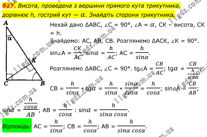 Висота, проведена з вершини прямого кута трикутника, дорівнює h, гострий кут — α. Знайдіть сторони трикутника. Нехай дано ∆АВС, ∠С = 90°, ∠А = α, СК – висота, СК = h. Знайдемо: АС, АВ, СВ. Розглянемо ∆АСК, ∠К = 90°. sin∠A = CK/AC; sinα = h/AC; AC = h/sinα. Розглянемо ∆АВС, ∠С = 90°. tg∠A = CB/AC; tgα = CB/(h/sinα); CB = h/sinα • tgα = h/sinα • sinα/cosα = h/cosα; sin∠A = CB/AB; sinα = (h/cosα)/AB; AB = h/cosα : sinα = h/(sinα cosα). Відповідь: АС = h/sinα; СВ = h/cosα; АВ = h/(sinα cosα).