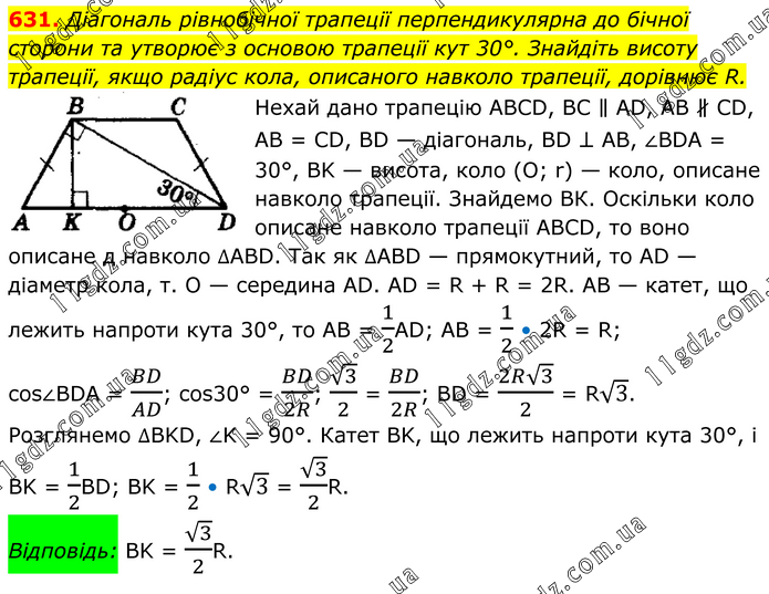 Діагональ рівнобічної трапеції перпендикулярна до бічної сторони та утворює з основою трапеції кут 30°. Знайдіть висоту трапеції, якщо радіус кола, описаного навколо трапеції, дорівнює R. Нехай дано трапецію ABCD, ВС ∥ AD, AB ∦ CD, AB = CD, BD — діагональ, BD ⊥ AB, ∠BDA = 30°, BK — висота, коло (О; r) — коло, описане навколо трапеції. Знайдемо ВК. Оскільки коло описане навколо трапеції ABCD, то воно описане д навколо ∆ABD. Так як ∆ABD — прямокутний, то AD — діаметр кола, т. О — середина AD. AD = R + R = 2R. АВ — катет, що лежить напроти кута 30°, то AB = 1/2AD; AB = 1/2 • 2R = R; cos∠BDA = BD/AD; cos30° = BD/2R; √3/2 = BD/2R; BD = (2R√3)/2 = R√3. Розглянемо ∆BKD, ∠K = 90°. Катет BK, що лежить напроти кута 30°, і BK = 1/2BD; BK = 1/2 • R√3 = √3/2R. Відповідь: BK = √3/2R.