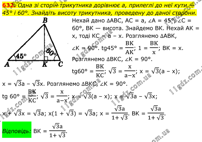 Одна зі сторін трикутника дорівнює а, прилеглі до неї кути — 45° і 60°. Знайдіть висоту трикутника, проведену до даної сторони. Нехай дано ∆АВС, АС = а, ∠А = 45°, ∠С = 60°, ВК — висота. Знайдемо ВК. Нехай АК = х, тоді КС = а – х. Розглянемо ∆АВК, ∠K = 90°. tg45° = BK/AK; 1 = BK/x; BК = х. Розглянемо ∆BKC, ∠K = 90°. tg60° = BK/KC; √3 = x/(a-x); х = √3(a – x); х = √3a – √3x. Розглянемо ∆ВКС, ∠К = 90°. tg 60° = BK/KC; √3 = x/(a-x); x = √3(a – x); x = √3a – √3x; x + √3x = √3a; x(1 + √3) = √3a; x = (√3 a)/(1+ √3). BK = (√3 a)/(1+ √3). Відповідь: ВК = (√3 a)/(1+ √3).