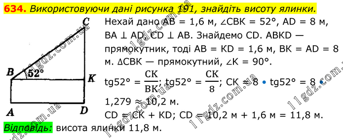 Використовуючи дані рисунка 191, знайдіть висоту ялинки. Нехай дано АВ = 1,6 м, ∠СВК = 52°, АD = 8 м, ВА ⊥ АD, СD ⊥ АВ. Знайдемо СD. АВКD — прямокутник, тоді АВ = КD = 1,6 м, ВК = АD = 8 м. ∆СВК — прямокутний, ∠K = 90°. tg52° = CK/BK; tg52° = CK/8; СК = 8 • tg52° = 8 • 1,279 ≈ 10,2 м. СD = СК + КD; СD = 10,2 м + 1,6 м = 11,8 м. Відповідь: висота ялинки 11,8 м.