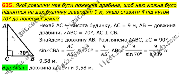 Якої довжини має бути пожежна драбина, щоб нею можна було піднятися на дах будинку заввишки 9 м, якщо ставити її під кутом 70° до поверхні землі? Нехай АС — висота будинку, АС = 9 м, АВ — довжина драбини, ∠АВС = 70°, АС ⊥ СВ. Знайдемо довжину АВ. Розглянемо ∆ABC, ∠C = 90°. sin∠CBA = AС/AB; sin70° = 9/AB; AB = 9/sin〖70°〗 = 9/0,939 ≈ 9,58 м. Відповідь: довжина драбини 9,58 м.