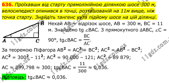 Проїхавши від старту прямолінійною ділянкою шосе 300 м, велосипедист опинився в точці, розташованій на 11м вище, ніж точка старту. Знайдіть тангенс кута підйому шосе на цій ділянці. Нехай АВ — відрізок шосе, АВ = 300 м, ВС = 11 м. Знайдемо tg ∠BAC. З прямокутного ∆ABC, ∠C = 90°, tg∠BAC = ВС/АС. За теоремою Піфагора АВ2 = АС2 + ВС2; АС2 = АВ2 – ВС2; АС2 = 3002 – 112; АС2 = 90 000 – 121; АС2 = 89 879; АС ≈ 299,798 ≈ 300; tg∠BAC = 11/300 ≈ 0,036. Відповідь: tg∠BAC ≈ 0,036.