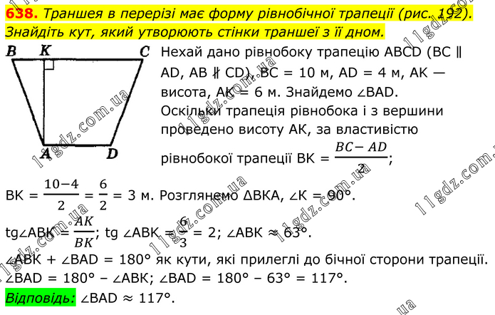 Траншея в перерізі має форму рівнобічної трапеції (рис. 192). Знайдіть кут, який утворюють стінки траншеї з її дном. Нехай дано рівнобоку трапецію ABCD (ВС ∥ AD, AB ∦ CD), ВС = 10 м, AD = 4 м, AK — висота, AK = 6 м. Знайдемо ∠BAD. Оскільки трапеція рівнобока і з вершини проведено висоту АК, за властивістю рівнобокої трапеції BK = (BC- AD)/2; BK = (10-4)/2 = 6/2 = 3 м. Розглянемо ∆ВКА, ∠К = 90°. tg∠АВК = AK/BK; tg ∠ABK = 6/3 = 2; ∠АВК ≈ 63°. ∠АВК + ∠ВАD = 180° як кути, які прилеглі до бічної сторони трапеції. ∠ВАD = 180° – ∠АВК; ∠ВАD = 180° – 63° = 117°. Відповідь: ∠ВАD ≈ 117°.