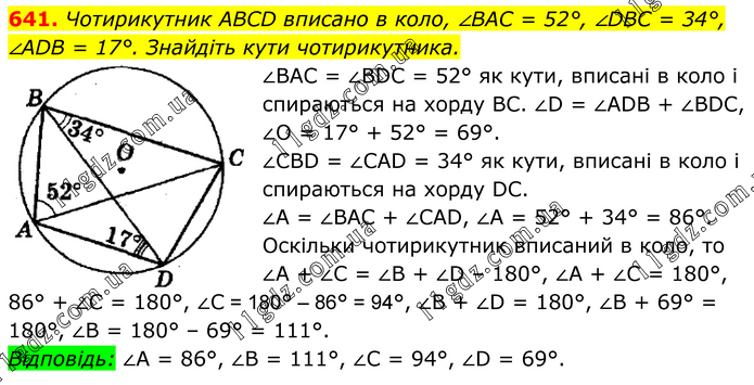 Чотирикутник ABCD вписано в коло, ∠BAC = 52°, ∠DBC = 34°, ∠ADB = 17°. Знайдіть кути чотирикутника. ∠ВАС = ∠ВDС = 52° як кути, вписані в коло і спираються на хорду ВС. ∠D = ∠АDВ + ∠ВDC, ∠О = 17° + 52° = 69°. ∠СВD = ∠САD = 34° як кути, вписані в коло і спираються на хорду DС. ∠А = ∠ВАС + ∠САD, ∠А = 52° + 34° = 86°. Оскільки чотирикутник вписаний в коло, то ∠А + ∠С = ∠В + ∠D – 180°, ∠А + ∠С = 180°, 86° + ∠С = 180°, ∠С = 180° – 86° = 94°, ∠B + ∠D = 180°, ∠B + 69° = 180°, ∠В = 180° – 69° = 111°. Відповідь: ∠А = 86°, ∠В = 111°, ∠С = 94°, ∠D = 69°.