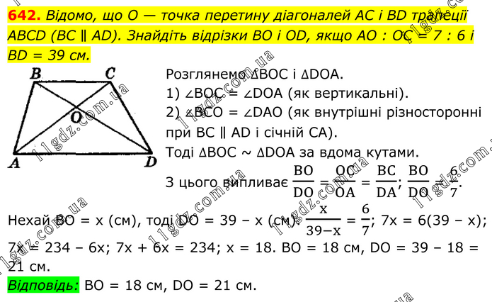 Відомо, що O — точка перетину діагоналей AC і BD трапеції ABCD (BC ∥ AD). Знайдіть відрізки BO і OD, якщо AO : OC = 7 : 6 і BD = 39 см. Розглянемо ∆ВОС і ∆DОА. 1) ∠ВОС = ∠DОА (як вертикальні). 2) ∠ВСО = ∠DАО (як внутрішні різносторонні при ВС ∥ АD і січній СА). Тоді ∆ВОС ~ ∆DОА за вдома кутами. З цього випливає BO/DO = OC/OA = BC/DA; BO/DO = 6/7. Нехай ВО = х (см), тоді DО = 39 – х (см). x/(39-x) = 6/7; 7x = 6(39 – x); 7х = 234 – 6х; 7х + 6х = 234; х = 18. ВО = 18 см, DО = 39 – 18 = 21 см. Відповідь: ВО = 18 см, DО = 21 см.