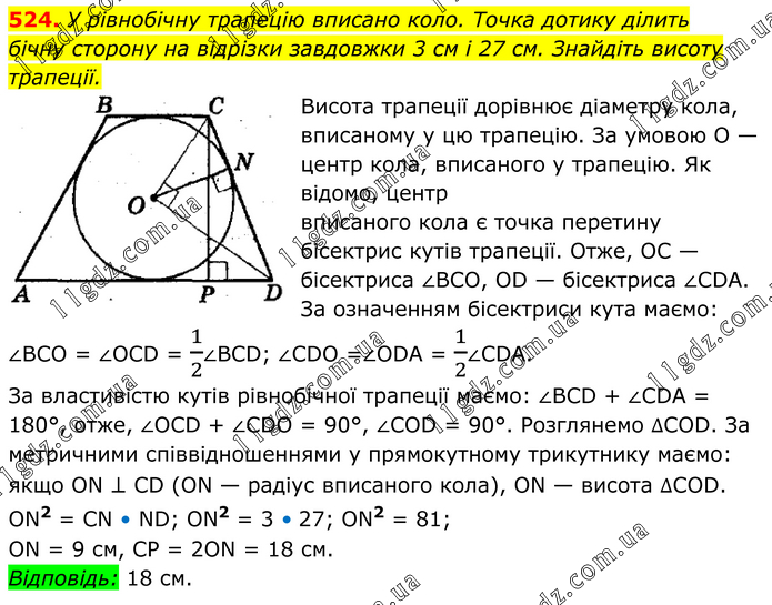 У рівнобічну трапецію вписано коло. Точка дотику ділить бічну сторону на відрізки завдовжки 3 см і 27 см. Знайдіть висоту трапеції. Висота трапеції дорівнює діаметру кола, вписаному у цю трапецію. За умовою О — центр кола, вписаного у трапецію. Як відомо, центр вписаного кола є точка перетину бісектрис кутів трапеції. Отже, ОС — бісектриса ∠ВСО, ОD — бісектриса ∠СDА. За означенням бісектриси кута маємо: ∠ВСО = ∠ОСD = 1/2∠ВСD; ∠СDO =∠ОDА = 1/2∠СDА. За властивістю кутів рівнобічної трапеції маємо: ∠ВСD + ∠СDА = 180°, отже, ∠ОСD + ∠СDO = 90°, ∠СОD = 90°. Розглянемо ∆СОD. За метричними співвідношеннями у прямокутному трикутнику маємо: якщо ОN ⊥ СD (ОN — радіус вписаного кола), ОN — висота ∆СОD. ОN2 = СN • ND; ОN2 = 3 • 27; ON2 = 81; ОN = 9 см, СР = 2ON = 18 см. Відповідь: 18 см.
