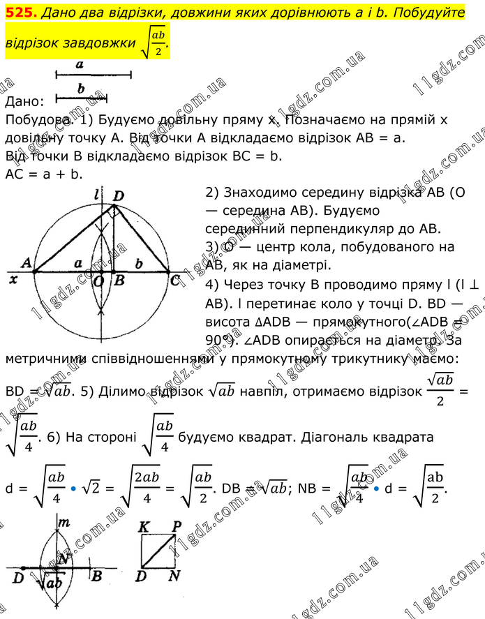 Дано два відрізки, довжини яких дорівнюють а і b. Побудуйте відрізок завдовжки √(ab/2). Дано: Побудова. 1) Будуємо довільну пряму х. Позначаємо на прямій х довільну точку А. Від точки А відкладаємо відрізок АВ = а. Від точки В відкладаємо відрізок ВС = b. АС = а + b. 2) Знаходимо середину відрізка АВ (О — середина АВ). Будуємо серединний перпендикуляр до АВ. 3) О — центр кола, побудованого на АВ, як на діаметрі. 4) Через точку В проводимо пряму l (l ⊥ АВ). l перетинає коло у точці D. BD — висота ∆ADB — прямокутного(∠ADB = 90°). ∠АDВ опирається на діаметр. За метричними співвідношеннями у прямокутному трикутнику маємо: BD = √ab. 5) Ділимо відрізок √ab навпіл, отримаємо відрізок √ab/2 = √(ab/4). 6) На стороні √(ab/4) будуємо квадрат. Діагональ квадрата d = √(ab/4) • √2 = √(2ab/4) = √(ab/2). DB = √ab; NB = √(ab/4) • d = √(ab/2).