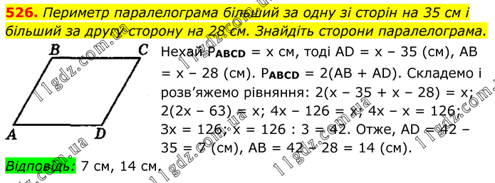 Периметр паралелограма більший за одну зі сторін на 35 см і більший за другу сторону на 28 см. Знайдіть сторони паралелограма. Нехай PABCD = x см, тоді AD = x – 35 (см), АВ = х – 28 (см). PABCD = 2(АВ + АD). Складемо і розв’яжемо рівняння: 2(х – 35 + х – 28) = х; 2(2х – 63) = х; 4х – 126 = х; 4х – х = 126; Зх = 126; х = 126 : 3 = 42. Отже, АD = 42 – 35 = 7 (см), АВ = 42 – 28 = 14 (см). Відповідь: 7 см, 14 см.