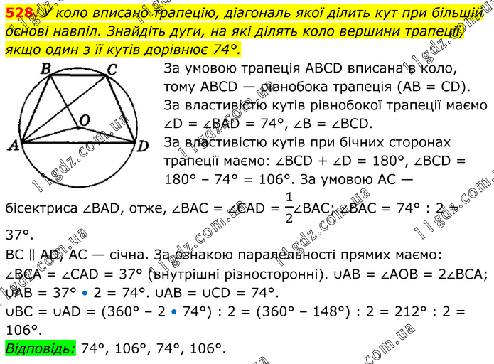 У коло вписано трапецію, діагональ якої ділить кут при більшій основі навпіл. Знайдіть дуги, на які ділять коло вершини трапеції, якщо один з її кутів дорівнює 74°. За умовою трапеція АВСD вписана в коло, тому АВСD — рівнобока трапеція (АВ = СD). За властивістю кутів рівнобокої трапеції маємо ∠D = ∠ВАD = 74°, ∠В = ∠ВСD. За властивістю кутів при бічних сторонах трапеції маємо: ∠ВСD + ∠D = 180°, ∠ВСD = 180° – 74° = 106°. За умовою АС — бісектриса ∠ВАD, отже, ∠BAC = ∠CAD = 1/2∠BAC; ∠BAC = 74° : 2 = 37°. ВС ∥ АD, АС — січна. За ознакою паралельності прямих маємо: ∠ВСА = ∠САD = 37° (внутрішні різносторонні). ∪АВ = ∠АОВ = 2∠ВСА; ∪АВ = 37° • 2 = 74°. ∪АВ = ∪СD = 74°. ∪ВС = ∪АD = (360° – 2 • 74°) : 2 = (360° – 148°) : 2 = 212° : 2 = 106°. Відповідь: 74°, 106°, 74°, 106°.