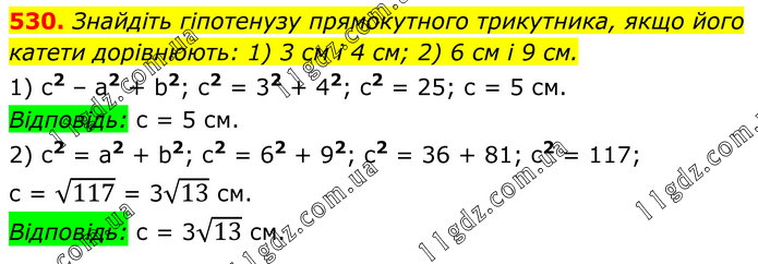 Знайдіть гіпотенузу прямокутного трикутника, якщо його катети дорівнюють: 1) 3 см і 4 см; 2) 6 см і 9 см. 1) с2 – а2 + b2; с2 = 32 + 42; c2 = 25; с = 5 см. Відповідь: с = 5 см. 2) с2 = а2 + b2; с2 = 62 + 92; с2 = 36 + 81; с2 = 117; с = √117 = 3√13 см. Відповідь: с = 3√13 см.