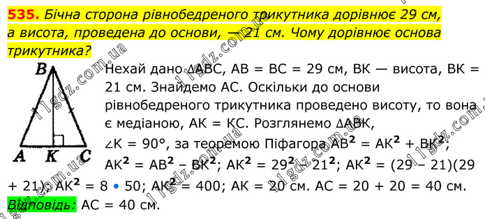 Бічна сторона рівнобедреного трикутника дорівнює 29 см, а висота, проведена до основи, — 21 см. Чому дорівнює основа трикутника? Нехай дано ∆АВС, АВ = ВС = 29 см, ВК — висота, ВК = 21 см. Знайдемо АС. Оскільки до основи рівнобедреного трикутника проведено висоту, то вона є медіаною, АК = КС. Розглянемо ∆АВК, ∠K = 90°, за теоремою Піфагора АВ2 = АК2 + ВК2; АK2 = АВ2 – ВК2; АК2 = 292 – 212; АК2 = (29 – 21)(29 + 21); АК2 = 8 • 50; АК2 = 400; АК = 20 см. АС = 20 + 20 = 40 см. Відповідь: АС = 40 см.