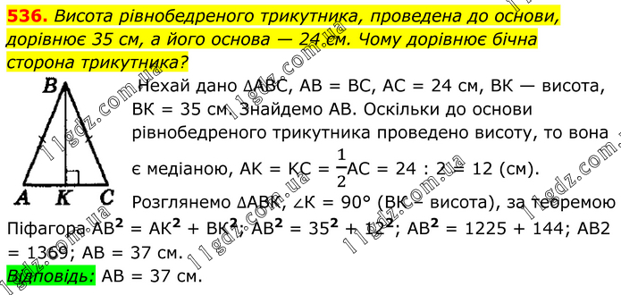 Висота рівнобедреного трикутника, проведена до основи, дорівнює 35 см, а його основа — 24 см. Чому дорівнює бічна сторона трикутника? Нехай дано ∆АВС, АВ = ВС, АС = 24 см, ВК — висота, ВК = 35 см. Знайдемо АВ. Оскільки до основи рівнобедреного трикутника проведено висоту, то вона є медіаною, AK = KC = 1/2AC = 24 : 2 = 12 (см). Розглянемо ∆АВК, ∠К = 90° (ВК – висота), за теоремою Піфагора АВ2 = АК2 + ВК2; АВ2 = 352 + 122; АВ2 = 1225 + 144; АВ2 = 1369; АВ = 37 см. Відповідь: АВ = 37 см.