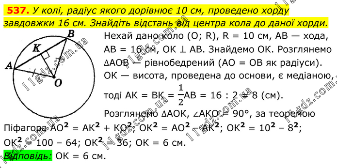 У колі, радіус якого дорівнює 10 см, проведено хорду завдовжки 16 см. Знайдіть відстань від центра кола до даної хорди. Нехай дано коло (О; R), R = 10 см, АВ — хода, АВ = 16 см, ОК ⊥ АВ. Знайдемо ОК. Розглянемо ∆АОВ — рівнобедрений (АО = ОВ як радіуси). ОК — висота, проведена до основи, є медіаною, тоді АК = ВК = 1/2АВ = 16 : 2 = 8 (см). Розглянемо ∆АОК, ∠АКО = 90°, за теоремою Піфагора АО2 = АК2 + КО2; ОК2 = АО2 – АК2; ОК2 = 102 – 82; ОК2 = 100 – 64; ОК2 = 36; ОК = 6 см. Відповідь: ОК = 6 см.